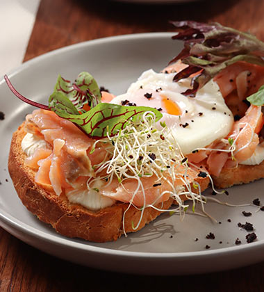 Sándwich de pan de nuez con bondiola, rúcula y queso crema. Medialuna con jamón y queso. Scon artesanal con mermelada y queso crema.